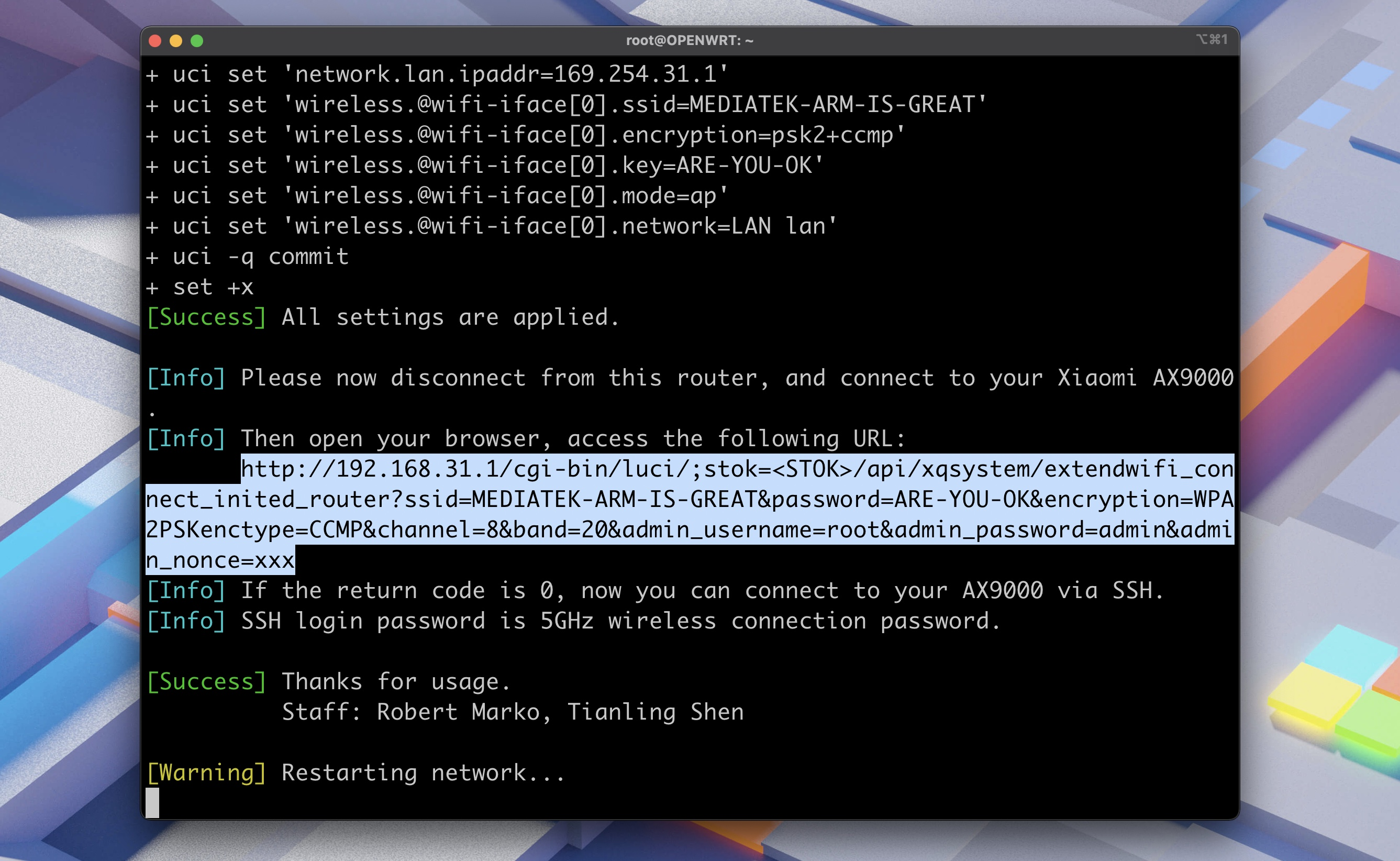 操作后这个脚本会修改我们 openwrt 路由器的 Wi-Fi 密码的一些设置,稍微等待一会,openwrt 插着电放在旁边即可,等会小米 AX9000 会连到 openwrt 的 Wi-Fi。