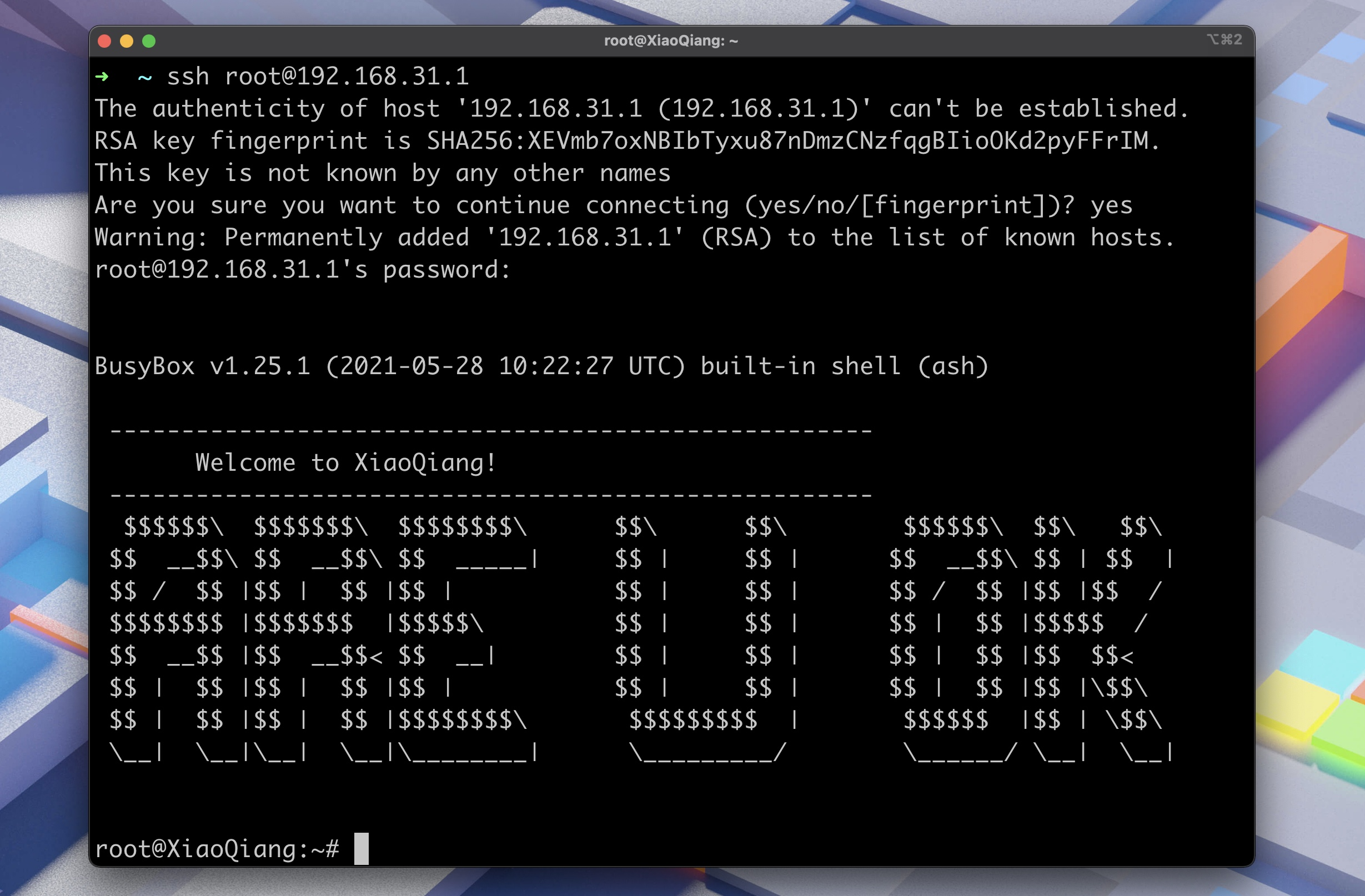 执行下面命令即可 ssh 连接到了路由器(输入 yes,密码是上面的,输入密码不会显示,输完回车即可)