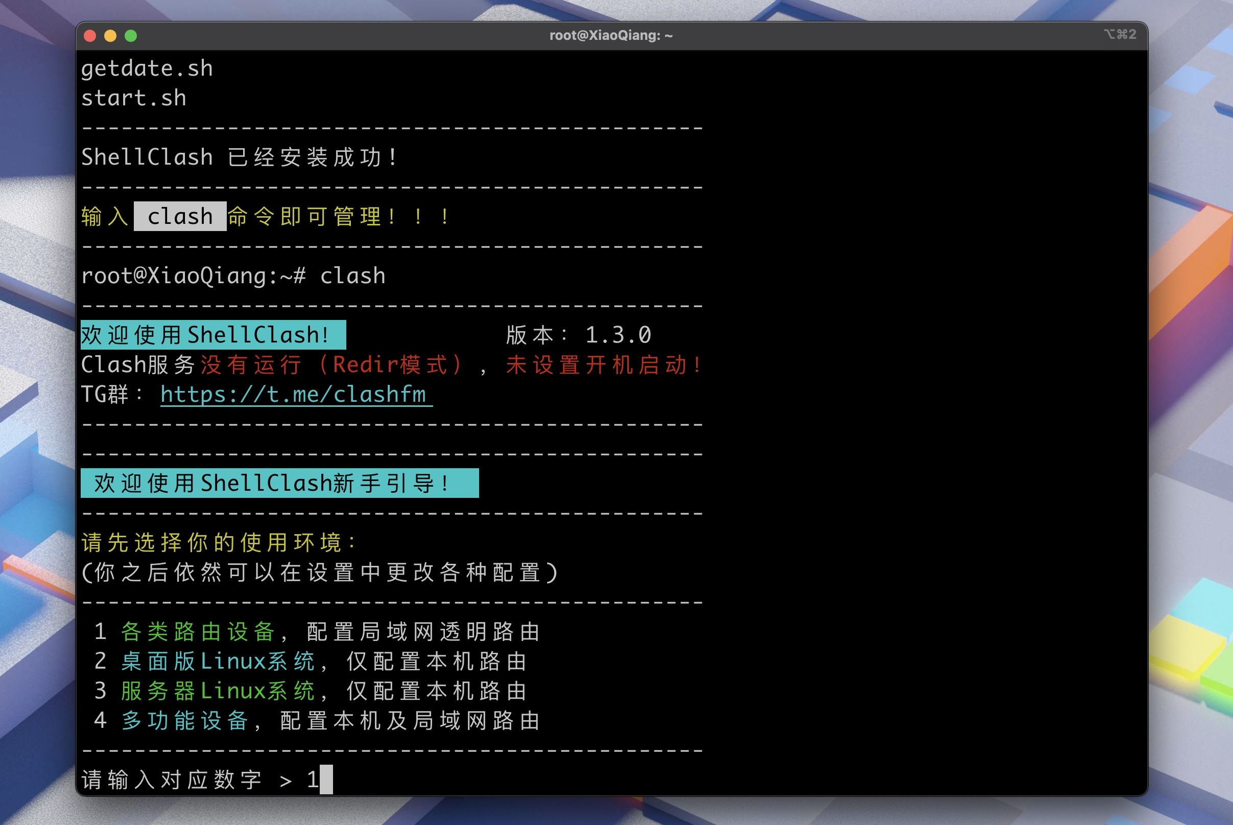 安装好就能使用 clash 命令了 ,输入 clash 就能进入配置。这里选择 1 各类路由器设备(如果你清楚别的可以自行选择)。