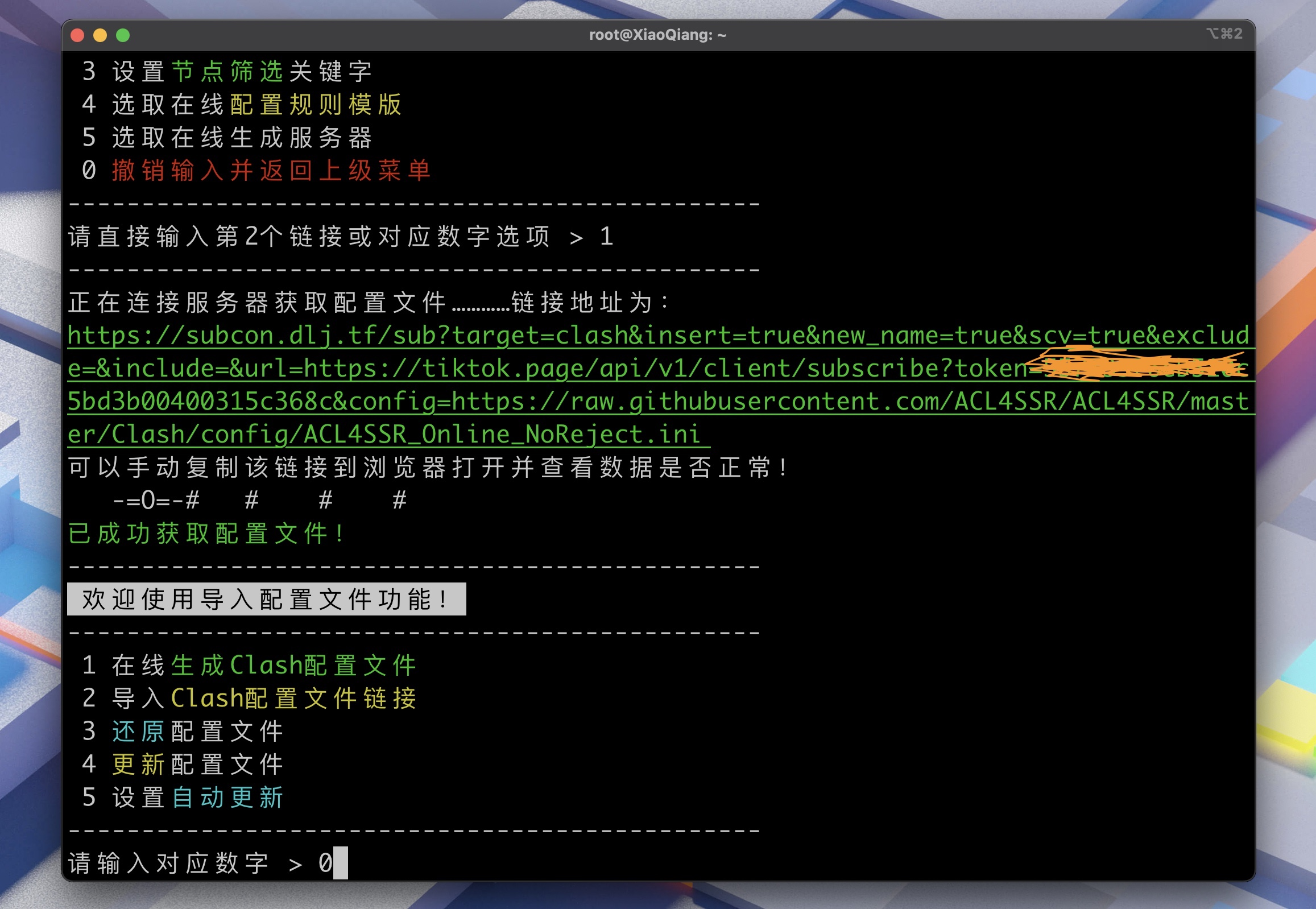 然后粘贴上你的订阅链接(url 链接),再选择 1 开始生成配置文件。生成配置文件后按 0 返回上层菜单即可。