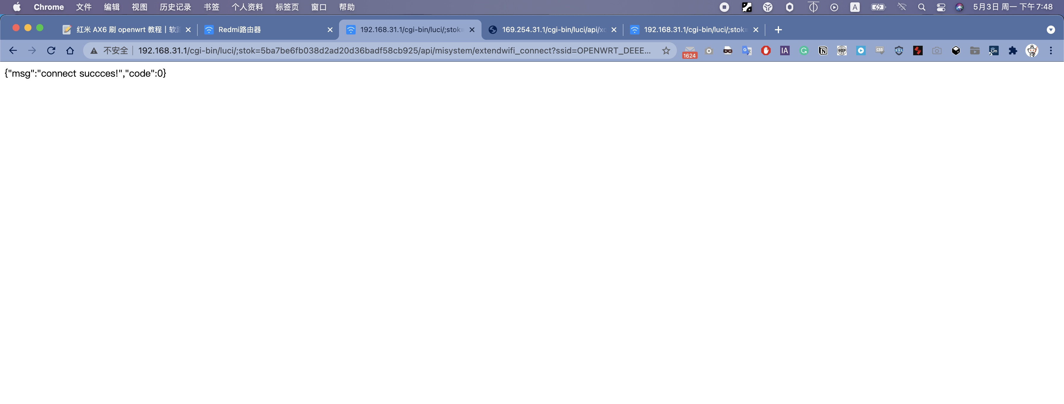 登陆小米路由器后台后,浏览器地址栏 stok= 后面的一段内容即是(选中部分),准备好备用。