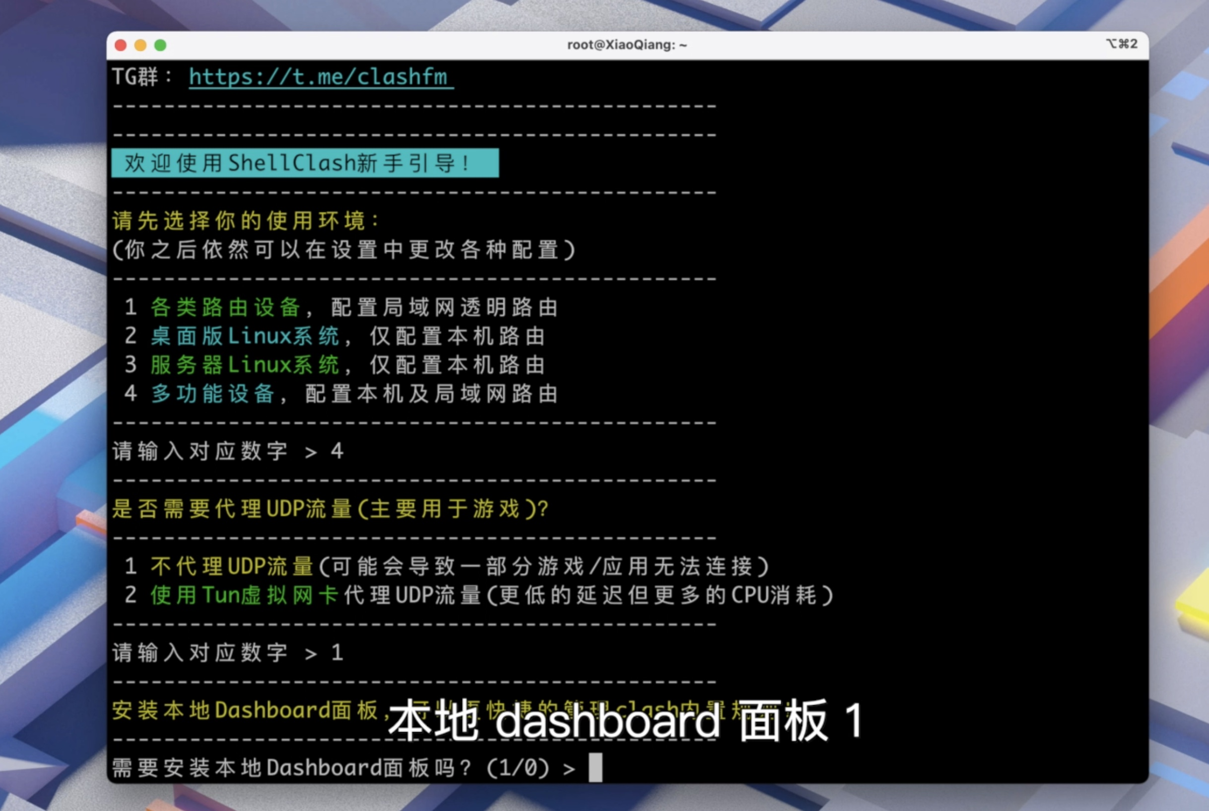推荐选择不代理 UDP 也就是 1,然后安装 DashBoard 面板也就能网页直接控制了也就是 1 。