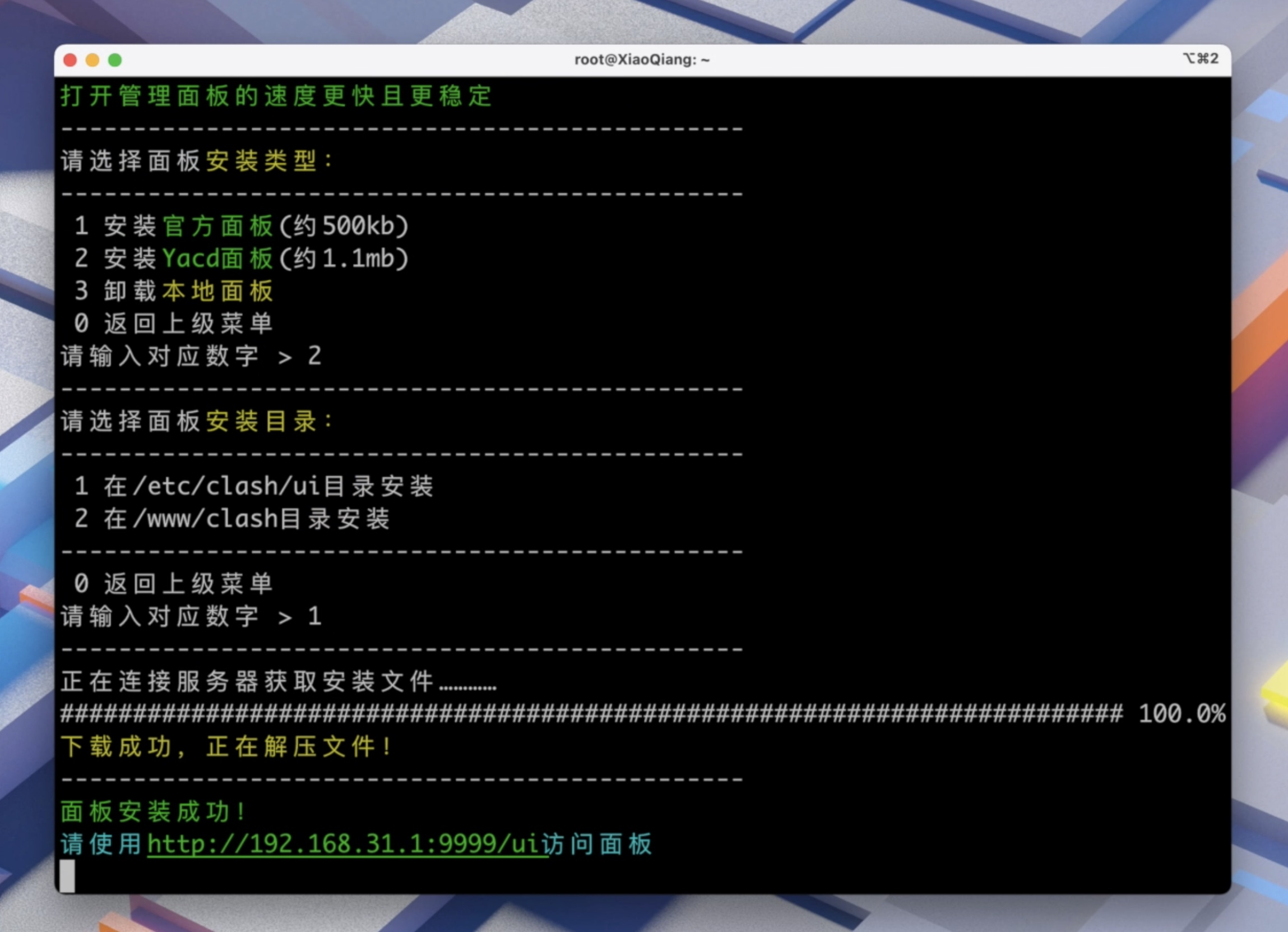 推荐选择 Yacd 面板,界面很好看 选择 2,然后安装目录选择 1 即可。