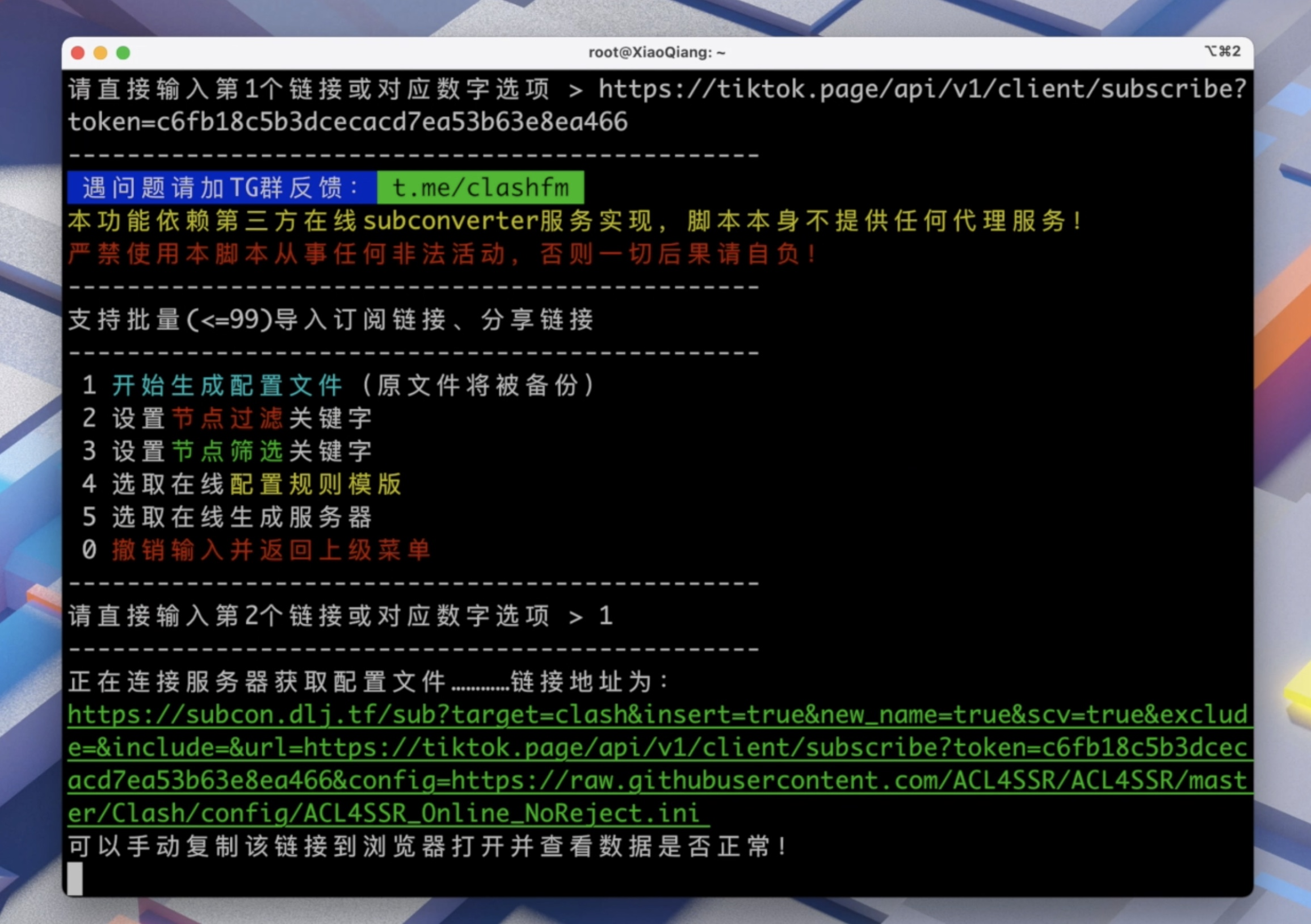 然后粘贴上你的订阅链接(url 链接),再选择 1 开始生成配置文件。生成配置文件后按 0 返回上层菜单即可。