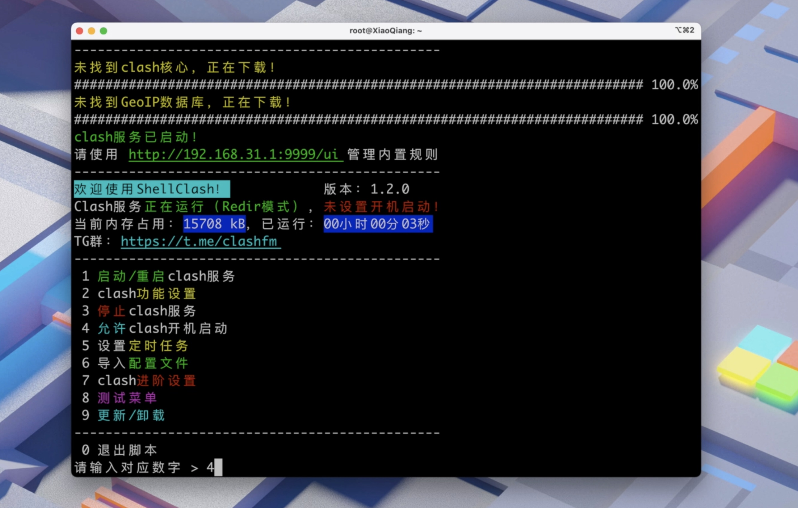 启动后你可以通过 http://192.168.31.1:9999/ui,进行节点的切换和规则的选择。当然你再按 4 选择开机启动也可以。