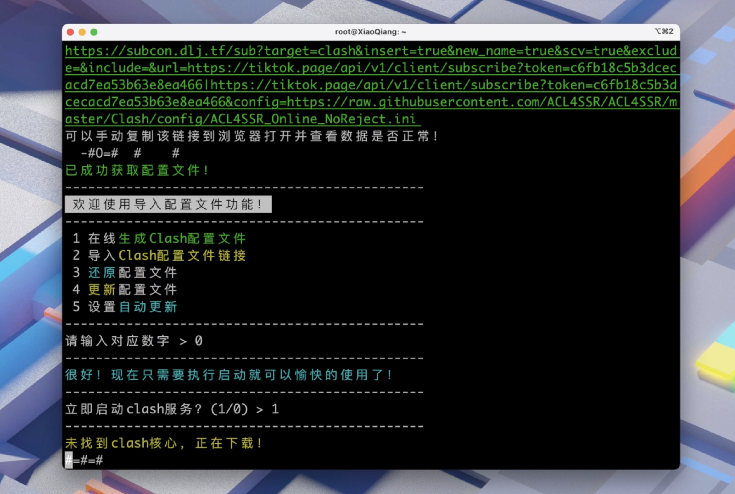 然后粘贴上你的订阅链接(url 链接),再选择 1 开始生成配置文件。生成配置文件后按 0 返回上层菜单即可。