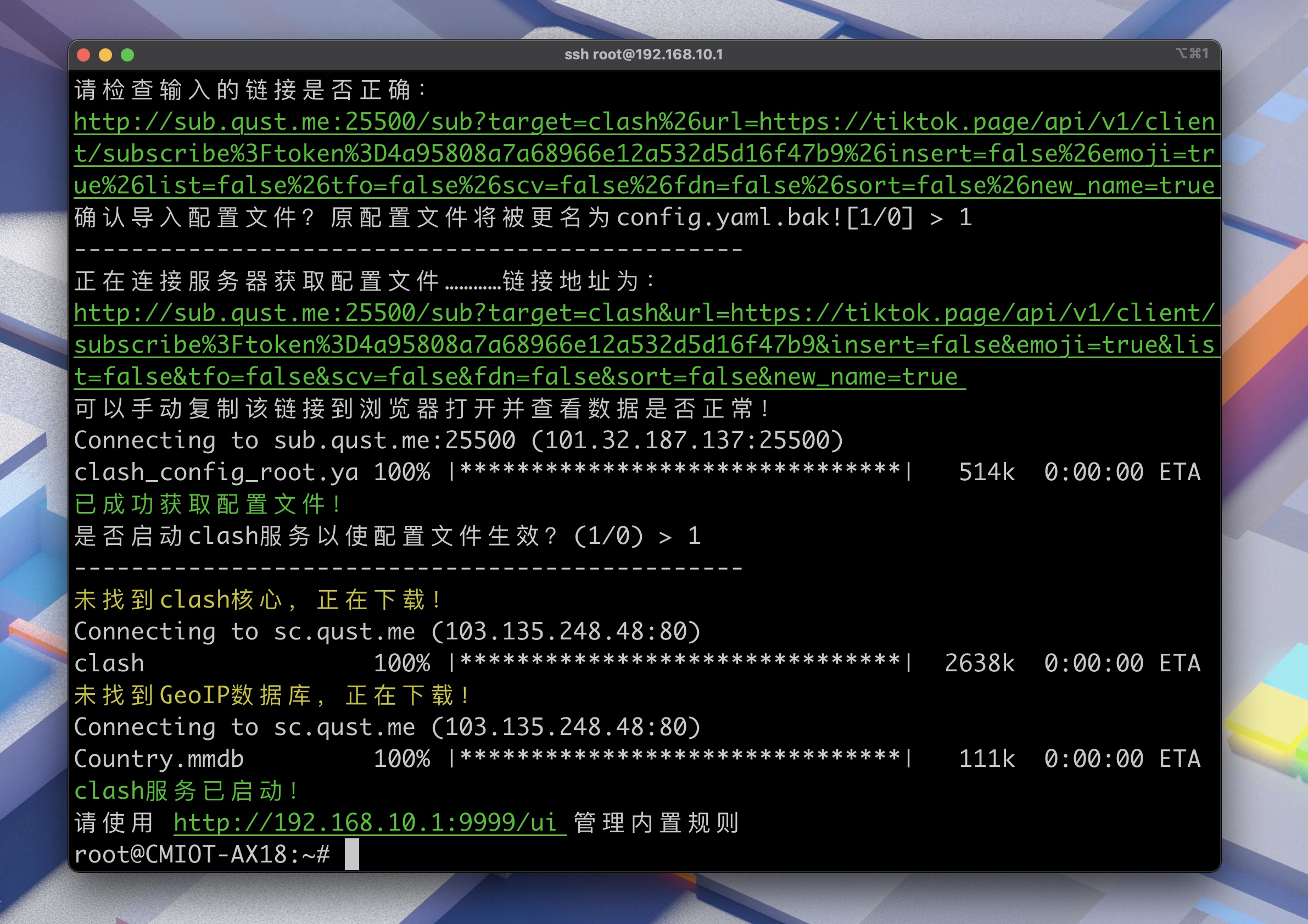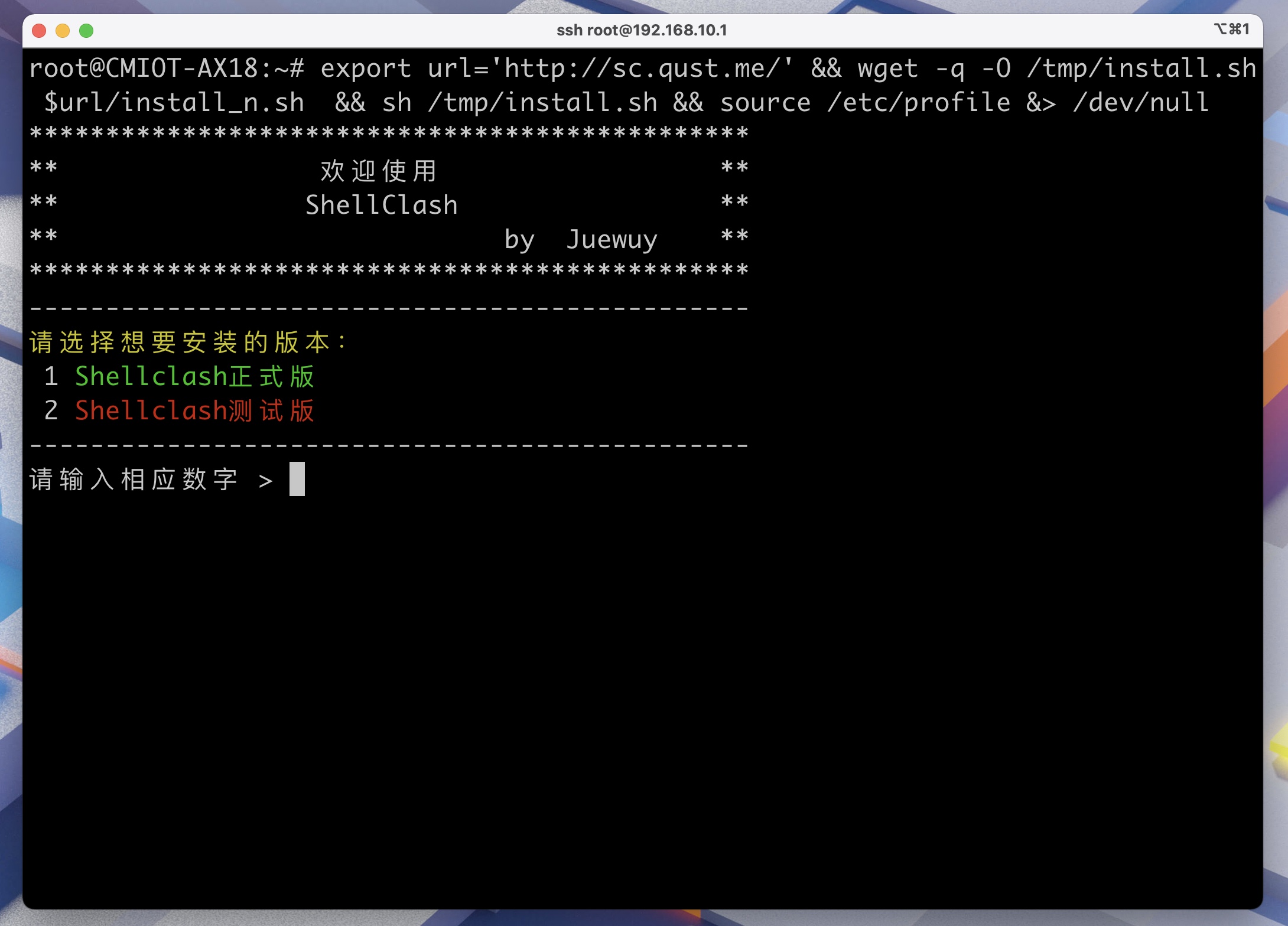 输入上面命令开始安装 ShellClash(因为 ax18 系用 wget 系统版本很低不支持 https,我这里提供了 http 版本的服务器)
