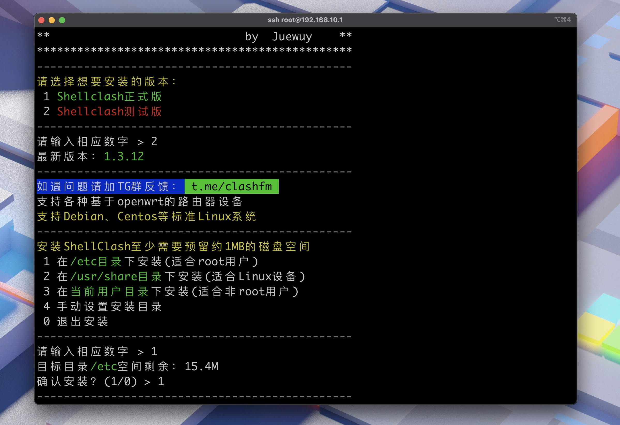 1 选择 etc 目录,1 确认 安装,安装好后我们就可以用 clash 命令配置 ShellClash 啦。