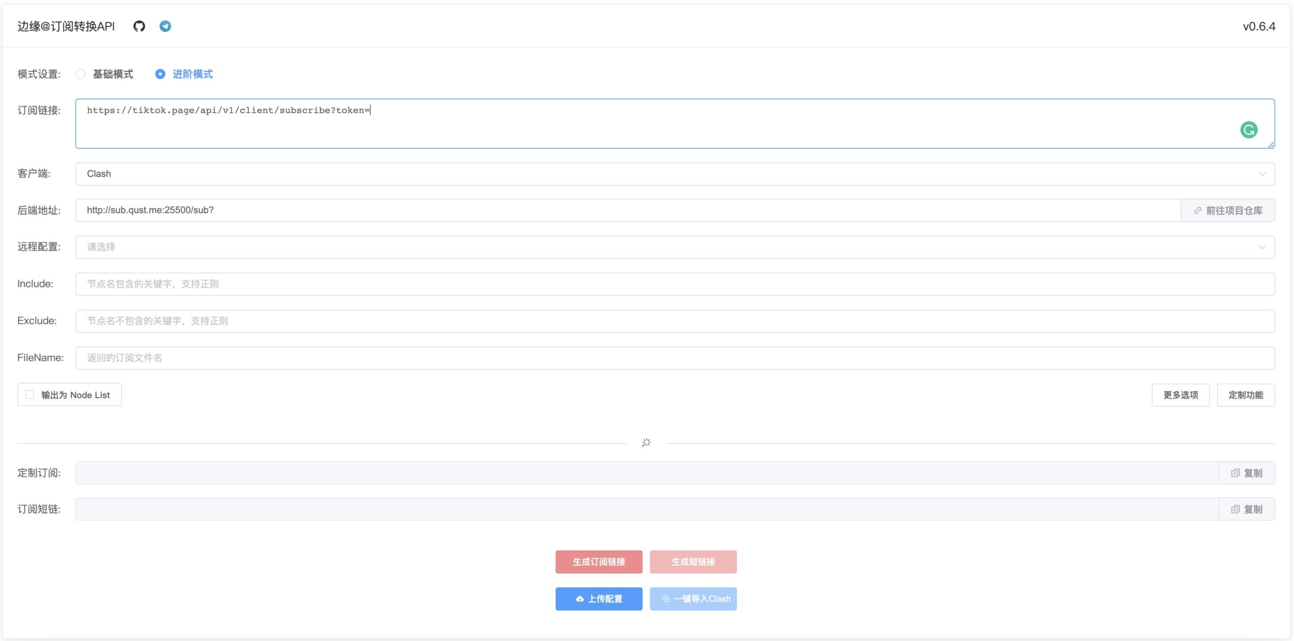 打开 边缘订阅转换 ,选择进阶模式,第一个空复制上你机场提供的订阅地址,后端地址填写下面的,然后选择生成订阅链接。