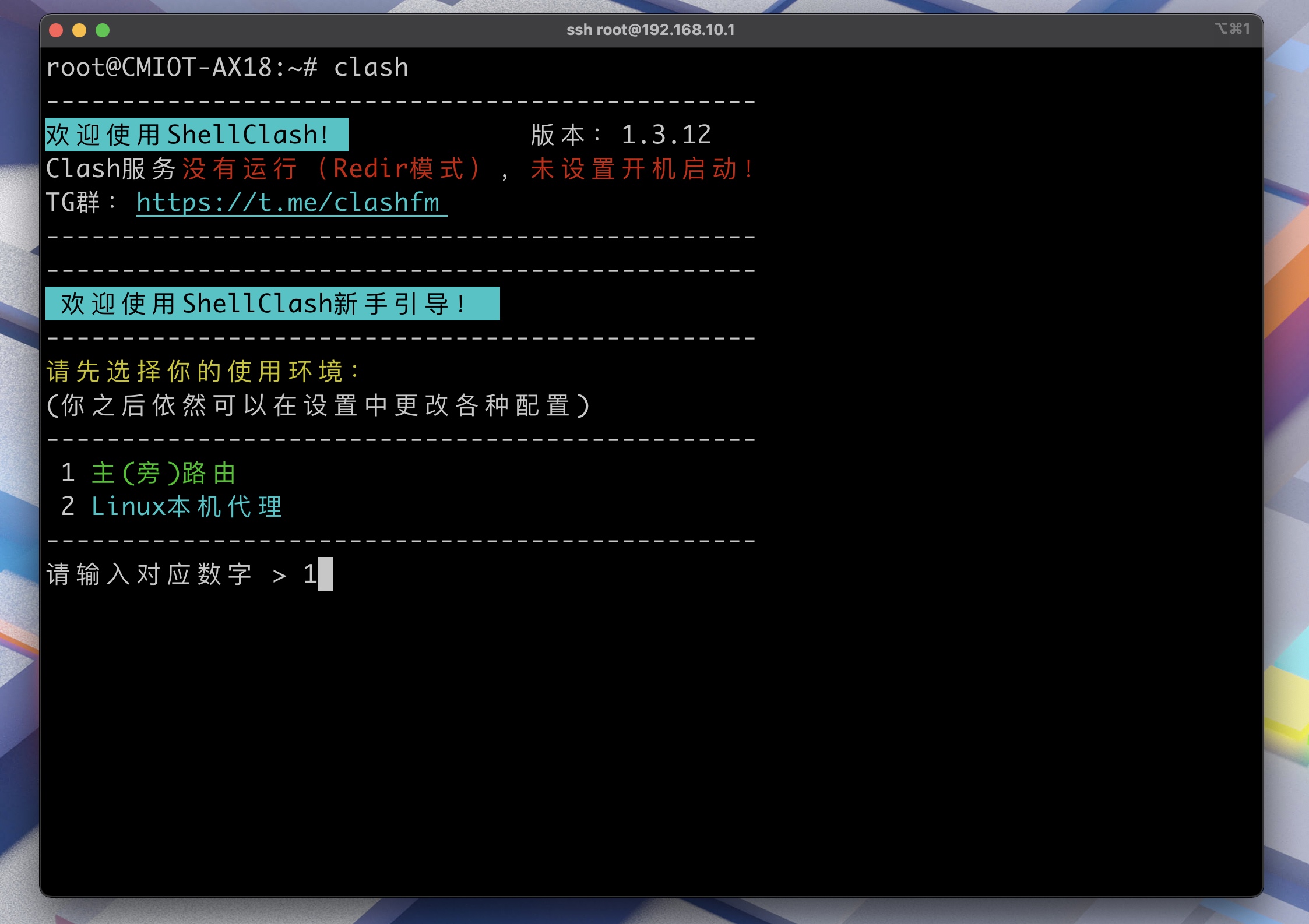 ssh 连接路由器后输入 clash,然后选择 1 主(旁)路由。