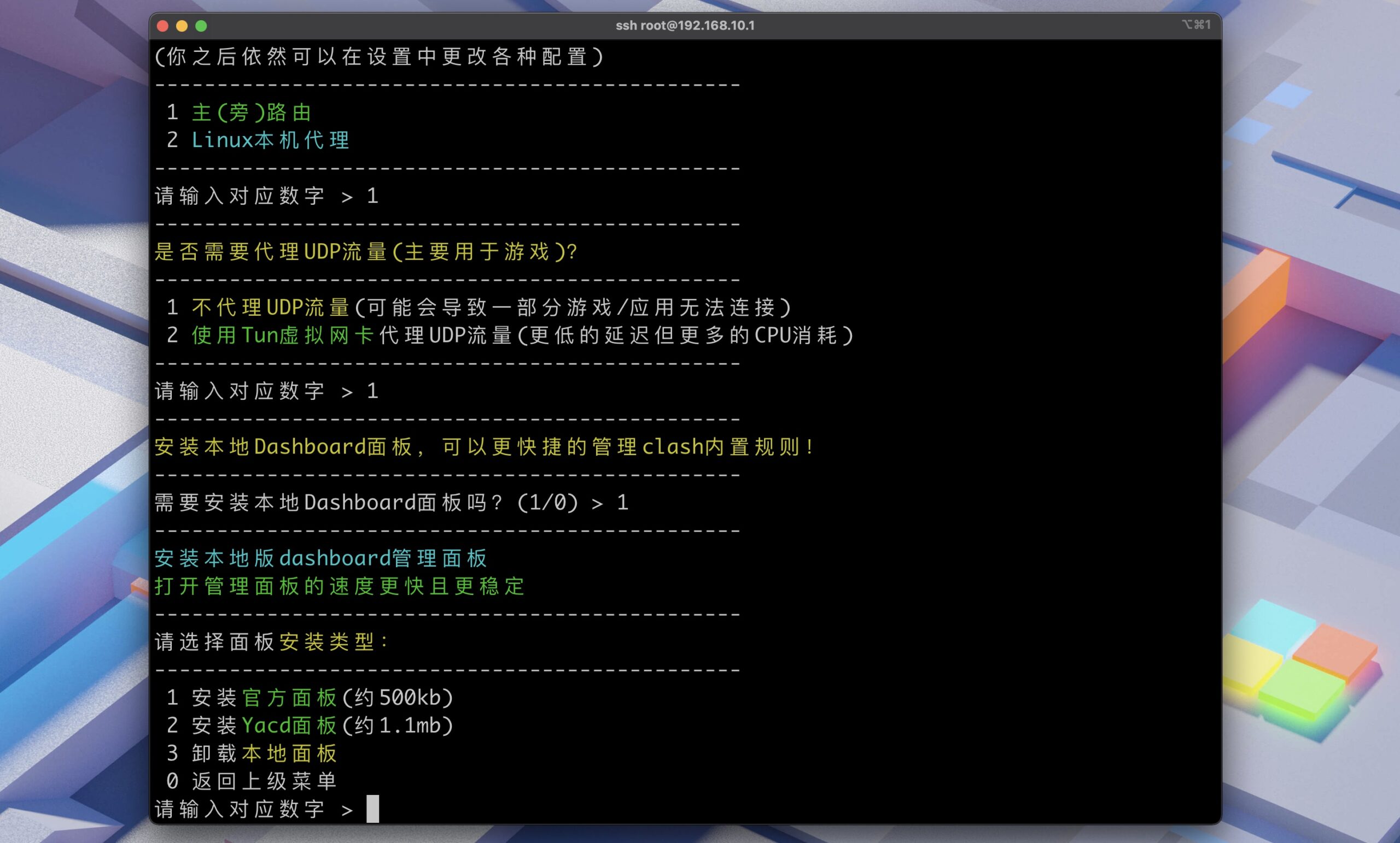 然后 1 不代理 UDP 流量,1 安装 Dashboard 面板,2 Yacd 面板,1 下载并安装根证书。