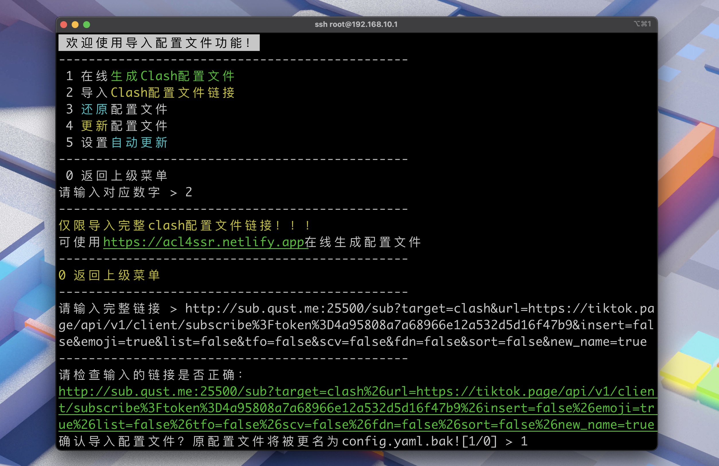 然后 1 开始导入配置文件,2 导入 Clash 配置文件链接,最后复制上你上一步得到的链接。
