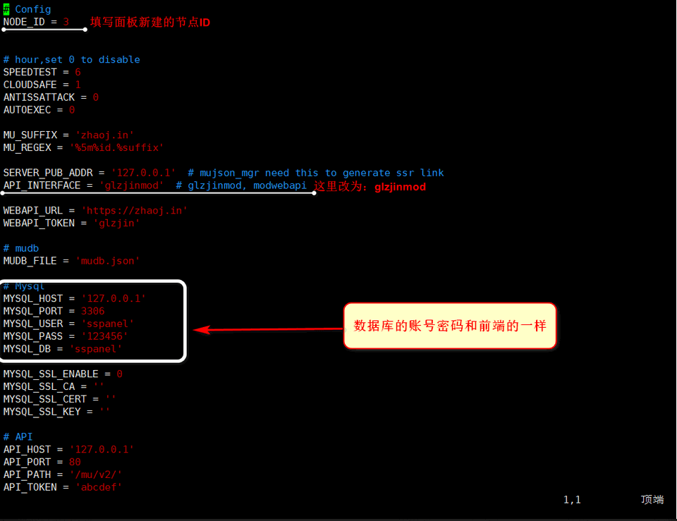 | 123456 | NODE_ID #改为面板对应的节点ID,上一步新建的节点IDAPI_INTERFACE #改为 glzjinmodMYSQL_HOST #如果面板和节点在一台机这里是localhost或者127.0.0.1 如果是远程面板,这里是远程面板数据库的IPMYSQL_USER #改为面板机数据库用户名MYSQL_PASS #改面板机数据库的密码MYSQL_DB #改为面板机数据库的名字 |