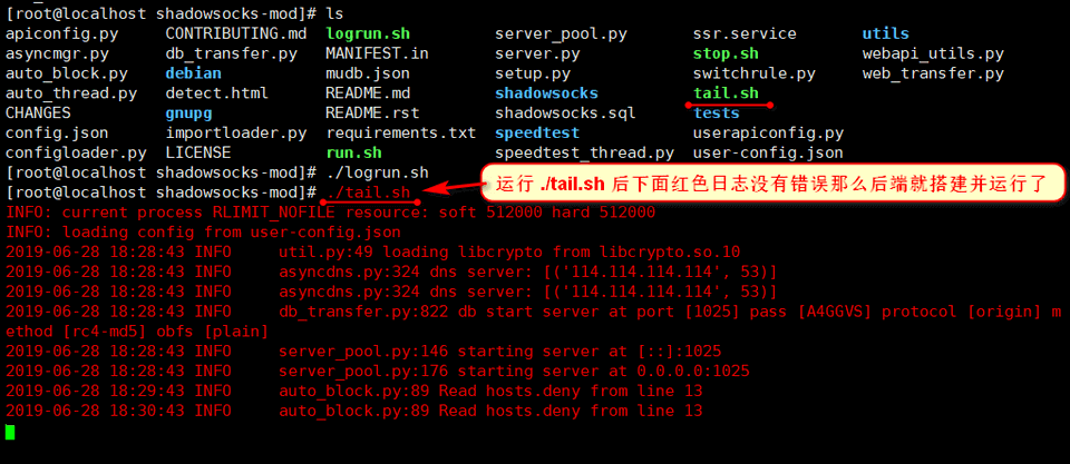 后端相关参数配置完毕后,进入shadowsocks-mod目录执行 ./logrun.sh这样后端就跑起来了
