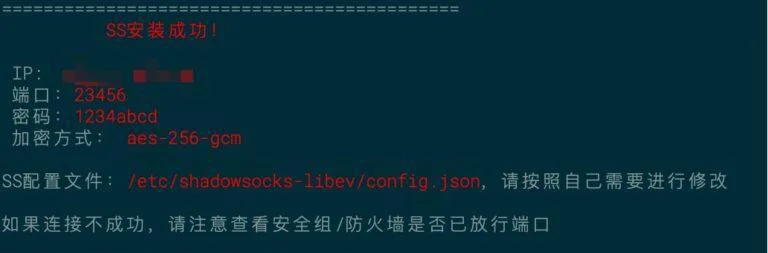 接下来屏幕上开始疯狂出现一堆你看得懂也可能看不懂的东西,如果安装过程卡住,请耐心等待几分钟;期间网络断开(windows上表现为黑框框中或者顶部标题出现disconnected字样,mac表现为终端出现“closed by remote host”或”broken pipe”),请重新连接后再次执行命令。脚本执行成功后会输出SS配置,界面如下: